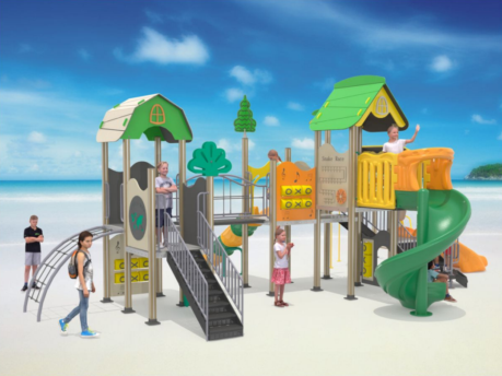 Estructuras de madera plastificada, piedras de polietileno de alta densidad, tubo de polietileno de alta densidad Estructura metálica con postes de acero galvanizado de 4" cedula 30, con cuerda de nylon con alma de acero a 8 hilos unida por esferas de acero, pintura electrostática previo tratamiento de fosfato de zinc.